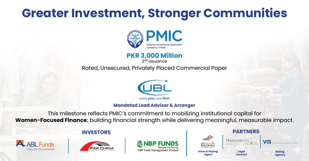Pakistan Microfinance Investment Company Limited (PMIC) is pleased to announce the successful issuance of its second PKR 3,000 million Rated, Unsecured, Privately Placed Commercial Paper, marking our continued presence and growing acceptance in Pakistan’s capital markets. Expanding the issuance by PKR 500 million over PMIC’s inaugural transaction, this offering was oversubscribed and achieved improved pricing, signalling growing investor confidence and strengthening market traction.