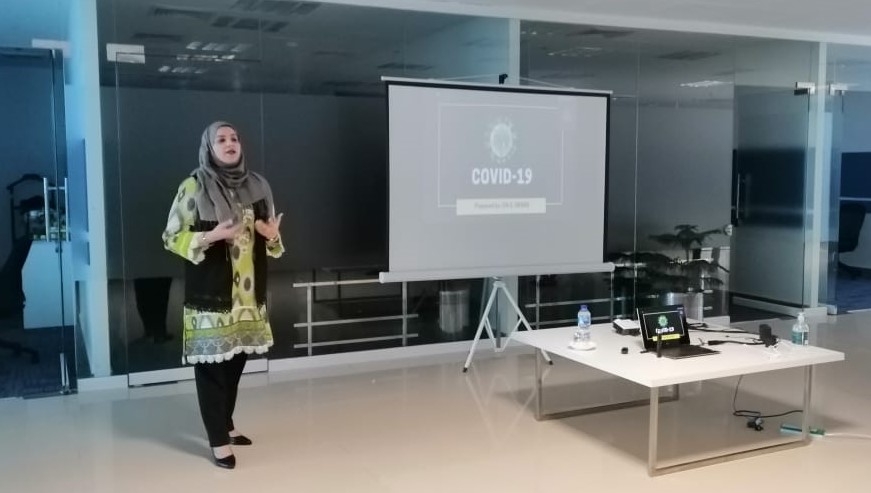 The informative session conducted by Ms. Hasan provided an overview of the Corona Virus, WHO recent updates on COVID-19 , mode of transmission among humans, incubation period and symptoms of disease progression, myths and misconceptions, hygiene and prevention (hand washing demonstration, use of sanitizers, way to cough and sneeze without spreading germs, door handles cleanliness etc), social distance, Corona control practices at the workplace, WHO traveling guidelines for frequent travelers and treatment. Moreover, the staff had an opportunity to ask questions and gain clarity on the approach to keep themselves and their families safe!
